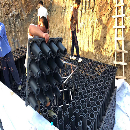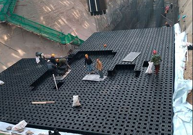 PP蓄水模塊采用可再生的聚丙烯材料制作而成,由不同規(guī)格尺寸的網(wǎng)格狀平板拼裝成模塊化的箱體,然后將每一個(gè)箱體碼放成為連續(xù)的雨水“矩陣”池。因?yàn)槠渚W(wǎng)格化透空的結(jié)構(gòu),材料的結(jié)構(gòu)占用空間不到5%。即模塊的蓄水空間達(dá)到95%以上,雨水可以在其中自由交換流動(dòng)。